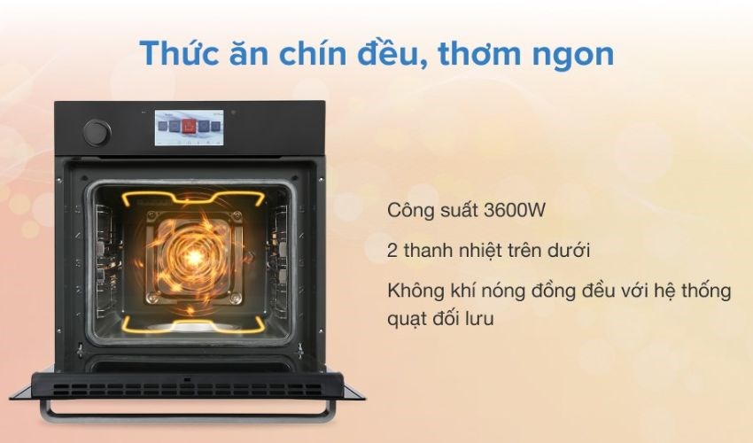 Lò nướng có chức năng hấp sử dụng công nghệ làm nóng thanh nhiệt kết hợp quạt đối lưu giúp luân chuyển nhiệt lượng đều khắp khoang lò giúp thực phẩm được chín đều từ trong ra ngoài.