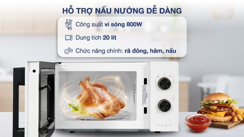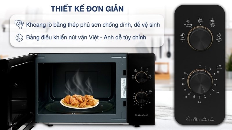 - Lò vi sóng không nướng nhưng vẫn được trang bị đầy đủ các chức năng cơ bản như nấu, hâm nóng, rã đông.