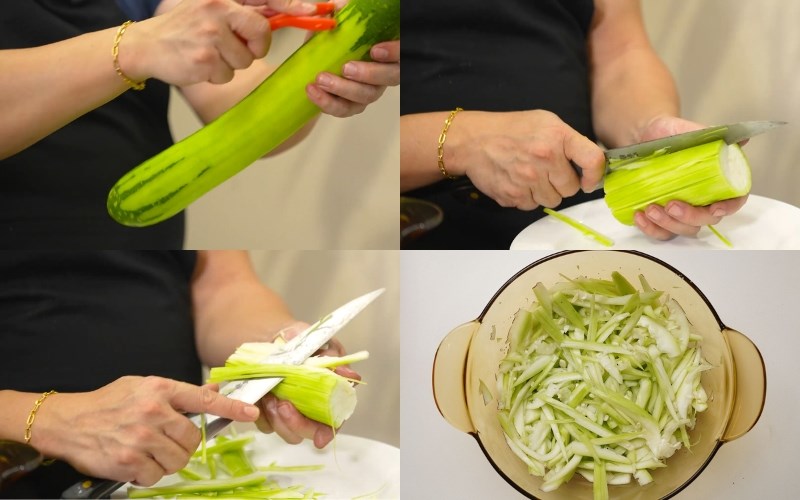 - Sơ chế: Bầu gọt sạch vỏ, rửa sạch với nước. Cắt bỏ phần cuống và đuôi.
