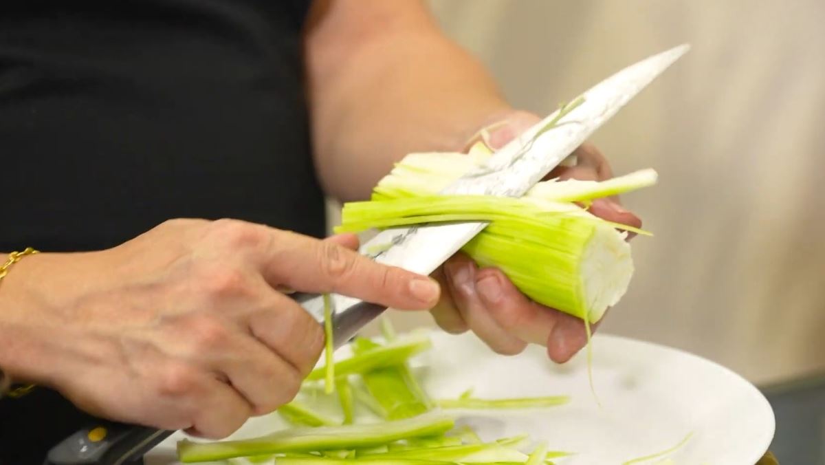 - Bào sợi: Đặt lưỡi bào lên thân quả bầu, dùng lực kéo dài từ trên xuống dưới để tạo ra các sợi bầu dài, mảnh. Xoay tròn quả bầu để bào đều xung quanh. Khi bào đến phần ruột xốp và hạt thì dừng lại (bỏ ruột).