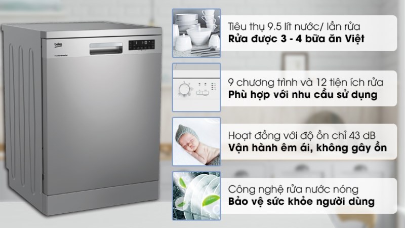 | Lượng nước tiêu thụ | khoảng 9.5 lít/lần rửa | khoảng 8 - 11 lít/lần rửa | khoảng 10 - 11 lít/lần rửa | khoảng 11.5 lít/lần rửa |