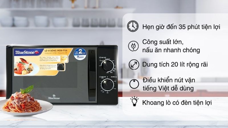 Không những thế, với chiếc lò vi sóng có nướng BlueStone MOB-7716 này còn giúp bạn thực hiện hâm đồ ăn hay nướng bánh sandwich, pizza, mì đút lò cho các con trước khi đi học, chồng đi làm chỉ trong tích tắc. Ngoài ra, máy có chức năng hẹn giờ đến 35 phút, giúp các mẹ yên tâm chế biến các món ăn khác, tiết kiệm thời gian, không lo muộn giờ học/làm đâu nhé!