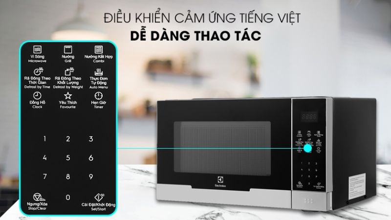 Lò vi sóng có nướng Electrolux EMG23DI9EBP 23 lít thông minh, hiện đại hơn nhờ bộ điều khiển hoàn toàn bằng cảm ứng nhạy tiếng Việt, chỉ với thao tác vuốt chạm không mất thời gian "mò mẫn" cho mỗi lần sử dụng.