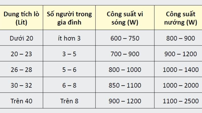 Vì thế, đừng vội chọn lò có công suất cao sẽ khiến bị dư thừa và hao tốn điện năng. Và ngược lại, lò có công suất thấp sẽ hoạt động chậm, mất thời gian. Bạn có thể tham khảo hình dưới đấy để hiểu hơn về công suất lò vi sóng nhé!