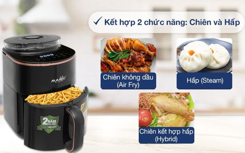 Ngoài ra, hiện nay cũng có một số loại nồi chiên không dầu hơi nước với khả năng hấp thức ăn. Do đó, với chức năng này có thể giúp bạn hâm đồ ăn bằng cách hấp hơi nước vô cùng tiện lợi mà vẫn giữ được độ ẩm và dinh dưỡng thức ăn.