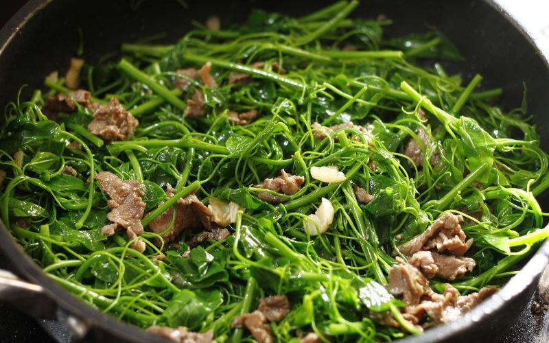 Thịt bò thường được sử dụng để làm những món rau xào và lần này là xào cùng rau bò khai.