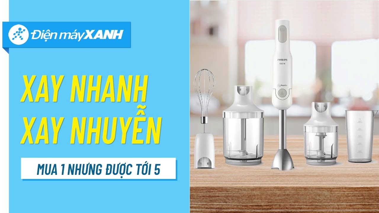 Công dụng chính của sản phẩm máy xay cầm tay Philips là xay sinh tố. Ngoài ra, máy còn được tích hợp nhiều tính năng khác như xay hạt, xay thịt, đánh trứng,... nhờ các phụ kiện đi kèm như cối xay, que đánh trứng.