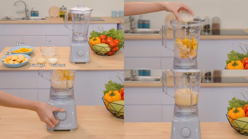 Đầu tiên, bạn cần rửa sạch và cắt xoài và mít thành miếng vừa ăn. Tùy vào khẩu vị của gia đình mà gia giảm lượng đường, sữa hay đá nhé.