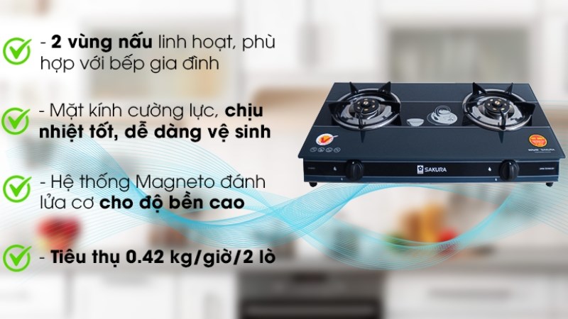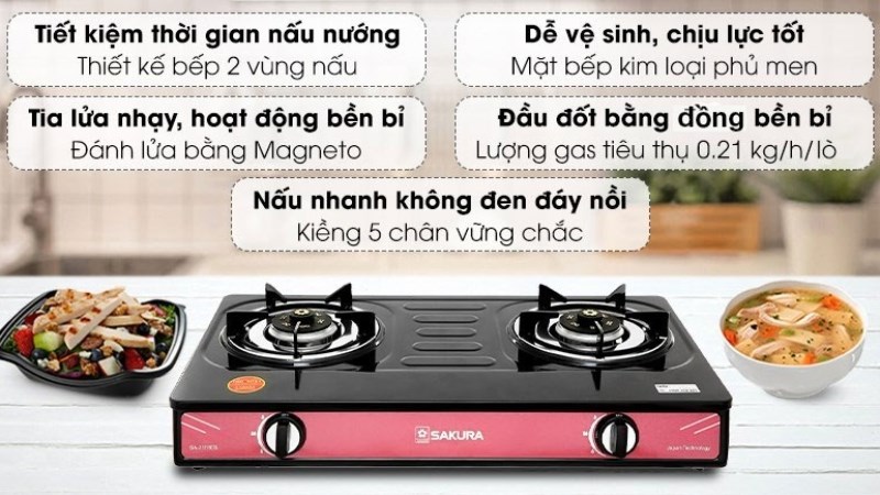 | Bếp ga đôi Sakura | Đồng thau, hợp kim nhôm, thép dập phủ men | Kính cường lực | Đầu đốt tiết kiệm gas | 0.21 - 0.33 kg/h/lò | 720.000 - 7.295.000 đồng |