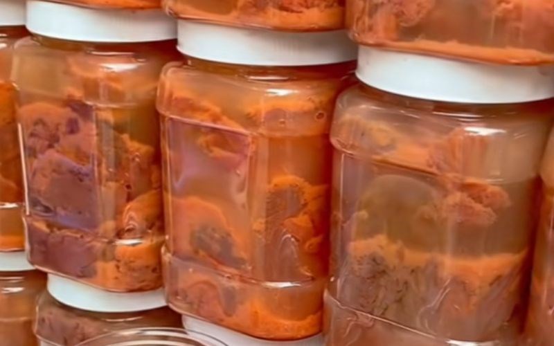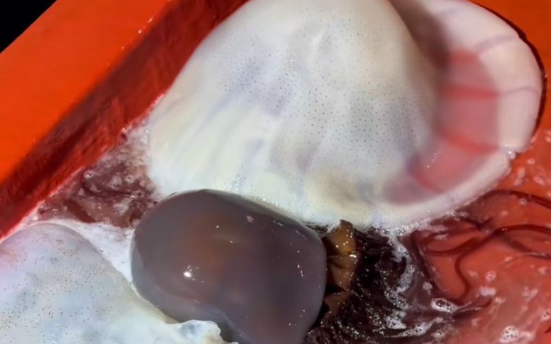 Mùi hương: Sứa đỏ đúng chuẩn hoàn toàn không có mùi tanh. Nó chỉ có mùi thơm thoang thoảng của thảo mộc (vỏ cây vẹt) và mùi thanh mát của nước muối nhạt. Nếu thấy sứa có mùi nồng hoặc mùi hóa chất lạ, tuyệt đối không nên mua.