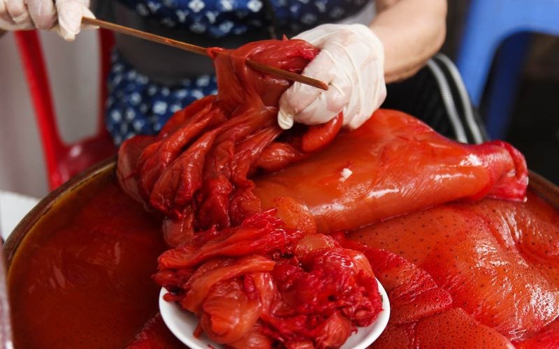 Sứa đỏ tự nhiên: Điểm nhận diện rõ nhất là sắc tố đỏ cam hoặc nâu hồng có sẵn từ khi còn sống dưới biển. Thân dù của chúng dày dặn, phần chân (xúc tu) to, ngắn, cuộn tròn và sẫm màu tự nhiên. Khi ngâm thêm vỏ cây vẹt, màu đỏ này trở nên thẫm hơn, thấm sâu vào từng thớ thịt.