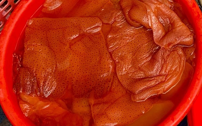 Quy trình chế biến: Để trở thành "sứa đỏ" trên các mâm gỏi vỉa hè, loại sứa này bắt buộc phải trải qua quá trình ngâm trong nước sắc từ vỏ cây sú và củ vẹt.
