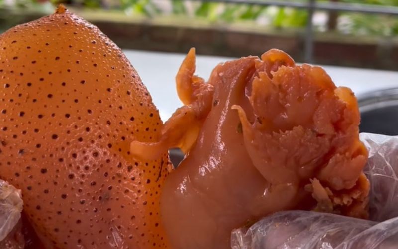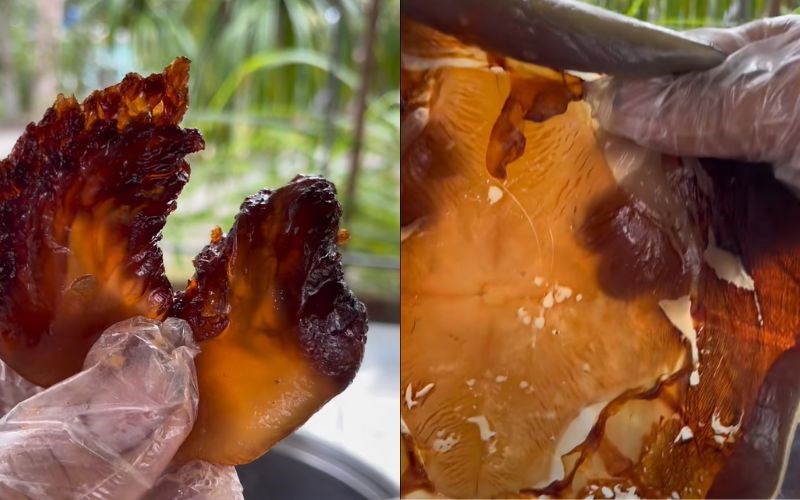 Độ đàn hồi: Một mẹo nhỏ là quan sát khi người bán dùng thanh tre (dao tre) để cắt sứa. Miếng sứa ngon sẽ có độ kháng cự lại lưỡi dao, khi cắt nghe tiếng "sựt" nhẹ và vết cắt sắc lẹm, không bị nhây hay ra nước bột.