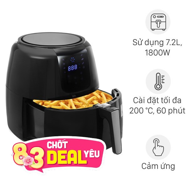 - Nồi chiên không dầu được trang bị bảng điều khiển cảm ứng hiện đại với các biểu tượng chức năng kết hợp màn hình hiển thị thông tin rõ ràng giúp người dùng tiện tùy chỉnh theo từng món ăn.