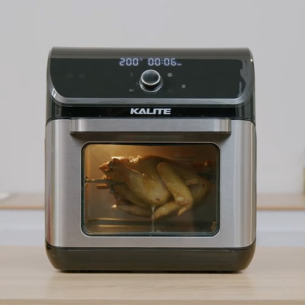 Nồi chiên không dầu Kalite KL-Q12 với 10 chương trình nấu cài đặt sẵn cùng bộ 6 dụng cụ hỗ trợ nấu nướng đi kèm giúp bạn chế biến được đa dạng món ăn thơm ngon, hấp dẫn. Hôm nay, hãy cùng Mẹo vào bếp review kỹ hơn về chức năng, ưu nhược điểm của mẫu nồi chiên không dầu này khi nướng gà nguyên con nhé!