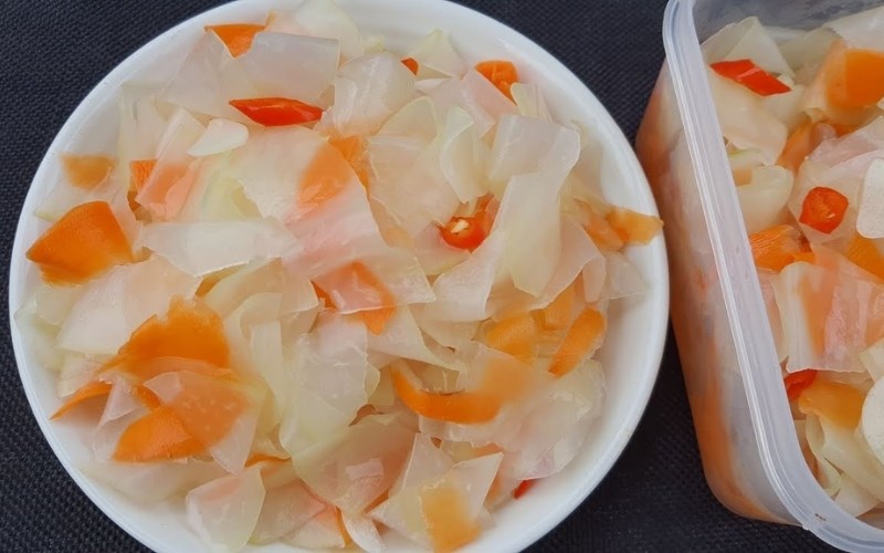 Cách làm đồ chua khá đơn giản: đu đủ xanh và cà rốt bào sợi, bóp muối nhẹ rồi rửa sạch, sau đó ngâm trong hỗn hợp giấm, đường, nước. Sự góp mặt của đồ chua làm tăng thêm hương vị phong phú cho món cuốn - trộn này.