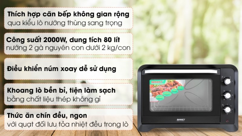 Lò nướng Sanaky LN.VH809S2D dung tích 80 lít, công suất 2000W, phù hợp cho gia đình đông người, quán ăn, nhà hàng. Lò sử dụng công nghệ làm nóng điện trở nhiệt, có quạt đối lưu luân chuyển nhiệt đồng đều, giúp thức ăn chín nhanh và thơm ngon.