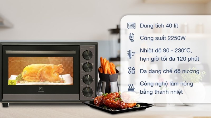 Dung tích 40 lít đủ để nướng gà nguyên con 2.5 kg, đáp ứng nhu cầu nấu nướng gia đình. Thiết kế cửa kính 2 lớp giữ nhiệt tốt, bảng điều khiển nút vặn độc lập dễ thao tác, phù hợp cả với người lớn tuổi.
