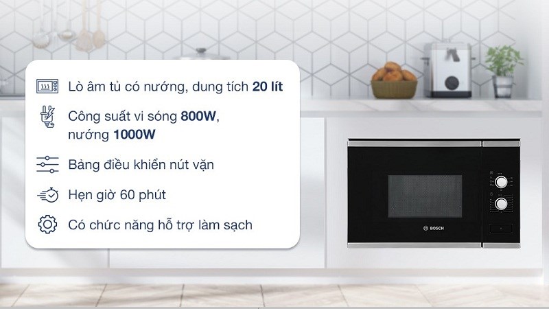Cuối cùng là sản phẩm lò vi sóng âm Bosch BFL634GB1B 21 lít đến từ thương hiệu Bosch của Đức, sản xuất tại Anh đảm bảo chất lượng vượt trội, tích hợp các tính năng hiện đại cùng thiết kế gọn gàng, lắp đặt âm tủ giúp tích kiệm diện tích và tăng thêm tính thẩm mỹ cho không gian bếp.
