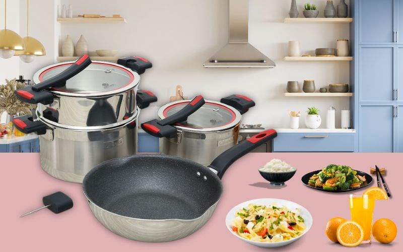 Đáy nồi và chảo của bộ sản phẩm đều gồm 3 lớp nên giữ cho thức ăn không dễ bị cháy. Thiết kế linh hoạt sử dụng được cho tất cả các loại bếp của bộ nồi chảo cũng mang lại sự tiện lợi cho khách hàng.