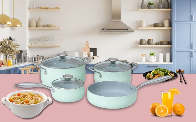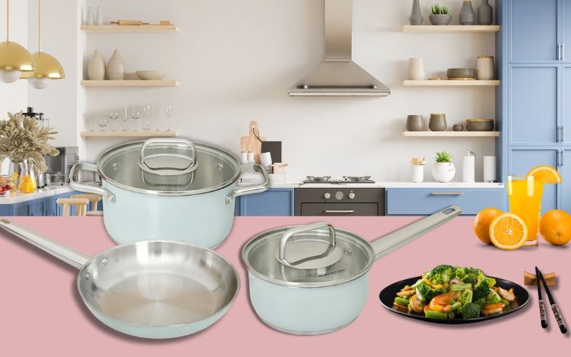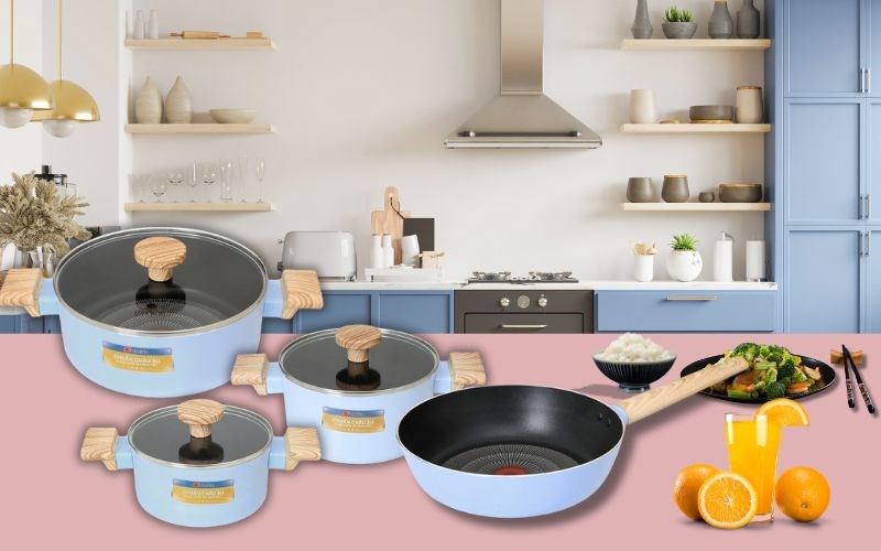 Nếu bạn là người yêu thích bảng màu pastel, chắc chắn đây sẽ là bộ sản phẩm khiến bạn cân nhắc. Bên ngoài nồi và chảo đều được phủ lên màu xanh nhẹ nhàng kết hợp tay cầm bằng nhựa vân gỗ mang hơi hướng Bắc Âu.