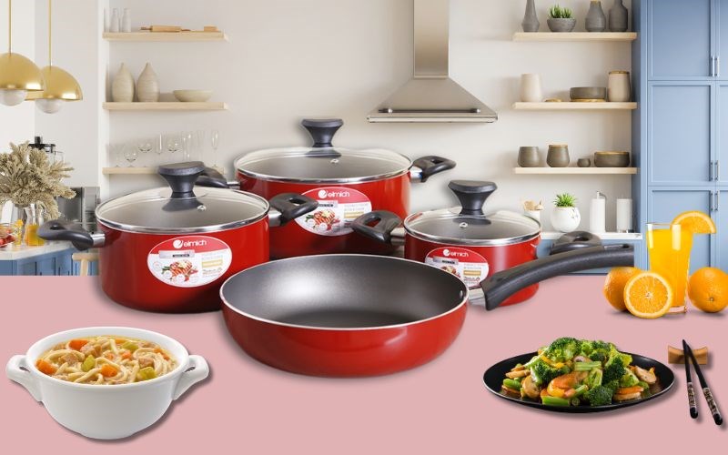Bộ nồi chảo nhôm chống dính nắp kính Elmich EL1162 gây ấn tượng đầu tiên với màu đỏ nổi bật. Thiết kế này không hề kén chọn mà ngược lại còn phù hợp với nhiều phong cách nội thất hiện nay.