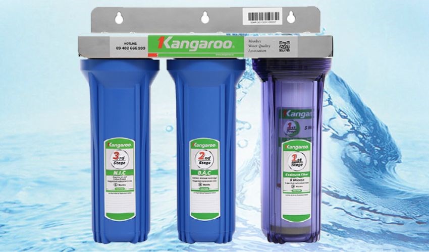 Bộ cốc lọc đầu nguồn Kangaroo với hệ thống 3 cốc lọc làm sạch nước đầu nguồn hiệu quả trước khi đưa vào máy lọc nước RO, giúp ngăn chặn bùn đất, tạp nhất lơ lửng, loại bỏ mùi Clo trong nước, các độc tố có trong nước.