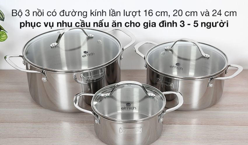 Bộ 3 cái nồi inox 3 đáy nắp kính Elmich Trimax XR EL-3843 có đường kính lần lượt 16 cm, 20 cm và 24 cm. Bộ sản phẩm phù hợp sử dụng cho gia đình 4 - 5 thành viên.