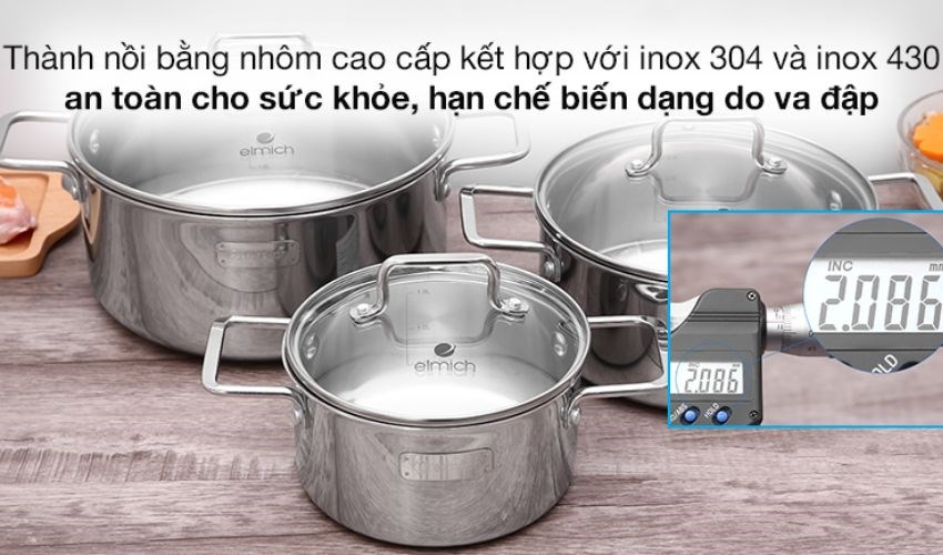 Thương hiệu Elmich sử dụng công nghệ mới với 3 lớp liền thân: lớp inox 304 bên trong cùng, nhôm nằm chính giữa và inox 430 bên ngoài. Nhờ đó mà nồi có khả năng chống oxy hóa cao, chống nhiễm các chất độc hại vào thức ăn, giúp thức ăn nhanh chín, tiết kiệm thời gian.