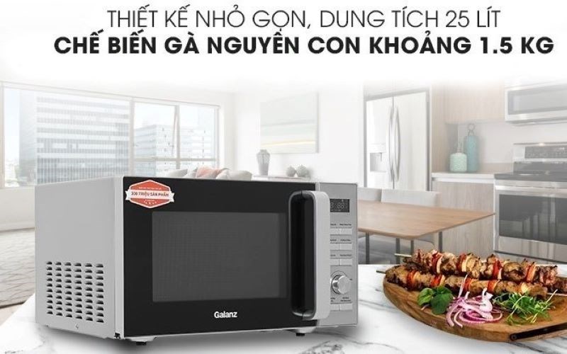 Cửa lò làm bằng kính cao cấp toát lên sự sang trọng, khoang lò có dung tích 25 lít, bằng thép không gỉ sáng bóng giúp vệ sinh dễ dàng. Lò hoạt động mạnh mẽ với công suất vi sóng 1400W, nướng 1000W làm chín thức ăn nhanh, tiết kiệm thời gian và điện năng.