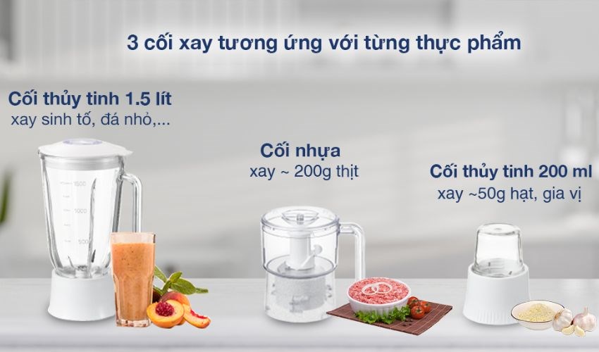 Cối lớn của máy có dung tích 1.5 lít, xay sinh tố, trái cây, đi kèm cối dùng xay hạt 0.2 lít, xay khô như xay tiêu, ớt, hành, tỏi..., cối xay thịt 0.33 lít phục vụ đa dạng cho công việc nấu ăn. Máy dễ dàng sử dụng nhờ bảng điều chỉnh bằng núm xoay trên chân đế.