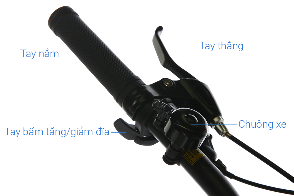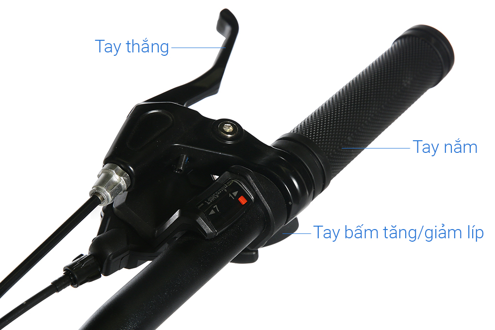 Ghi đông không sừng, dạng thẳng, cho tư thế cầm thoải mái, thẳng lưng giúp bảo vệ cột sống. Ngoài ra với thiết kế này có thể giúp xe dễ dàng vượt qua những địa hình hẹp, không gây vướng víu, dễ dàng vượt chướng ngại vật.