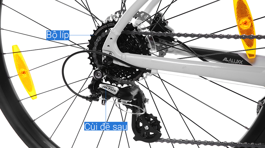 Xe đạp được trang bị hệ thống truyền động của hãng Shimano - thương hiệu uy tín và chất lượng đến từ Nhật Bản. Hệ thống bao gồm bộ 8 líp Shimano Altus kết hợp với 2 đĩa Shimano FD-TY710, đi kèm với dây sên KMC Z8.3 vận hành trơn tru, ổn định. Bộ đề đáp ứng 16 mức tốc độ, có khả năng chuyển số linh hoạt với một thao tác đơn giản giúp bạn dễ dàng điều chỉnh tốc độ theo ý muốn, hạn chế việc mất sức.