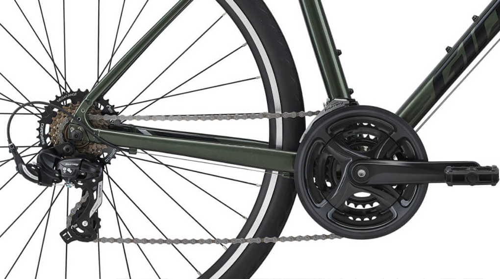 Xe đạp được trang bị bộ truyền động Shimano Tourney và bộ 3 đĩa 7 líp, vừa mang đến khả năng di chuyển trên đường trường, vừa thoải mái leo dốc, giúp bạn chinh phục mọi cung đường.