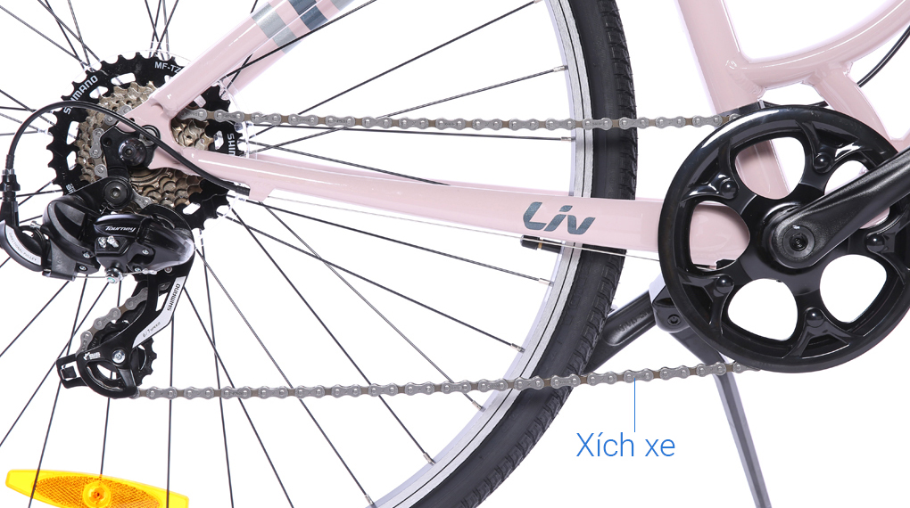 Xe đạp đường phố Giant Touring Liv Flourish 4 sở hữu bộ 7 líp Shimano Tourney kết hợp cùng sên xe KMC Z7 cho khả năng chuyển số mượt, chỉ với một thao tác xoay tay để chuyển số lên hoặc xuống, đem đến người dùng cảm giác êm ái và không bị mất thế khi đạp lên dốc.