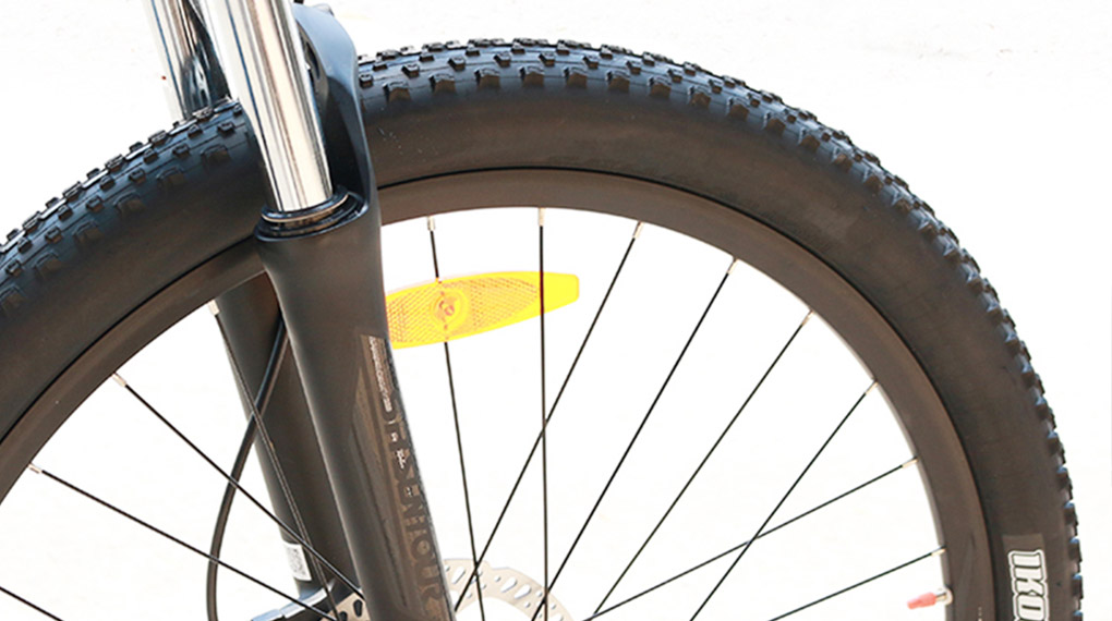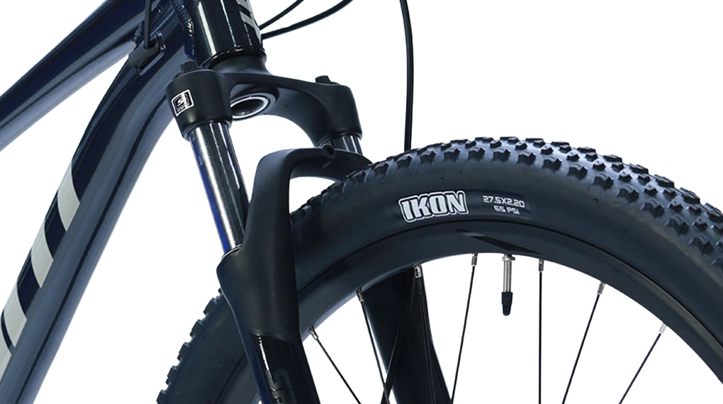 Đường kính của bánh là 27.5 inch kết hợp với lốp xe Maxxis Ikon, bên trên bề mặt lốp có nhiều gai và rãnh khía giúp tăng tiết diện tiếp xúc của bánh xe với mặt đường, bánh xe sẽ bám đường tốt hơn, chống trơn trượt. Với kích cỡ này, xe sẽ di chuyển với tốc độ nhanh hơn, đạp nhẹ và lướt êm hơn khi chạy trên đoạn đường sỏi đá hay địa hình xấu, gồ ghề.