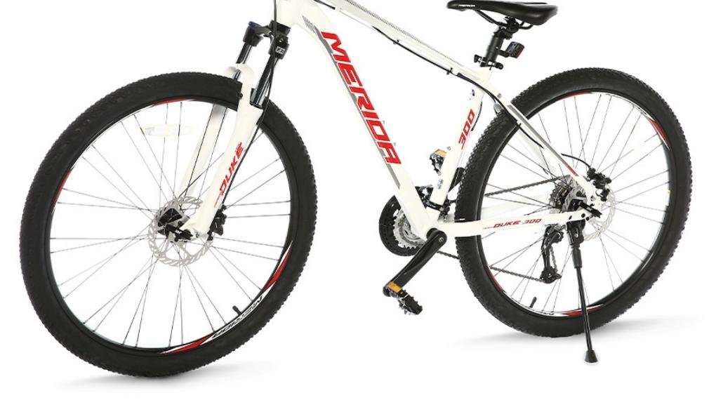 Xe đạp địa hình Merida Duke 300 sở hữu vẻ ngoài ấn tượng với nhiều phiên bản màu trẻ trung kết hợp logo Merida được in cách điệu trên khung sườn. Chiếc xe đầy cá tính này khá gọn nhẹ với khối lượng khoảng 15 kg, không chỉ phù hợp với những chuyến dã ngoại, leo núi mà còn thích hợp để người dùng rèn luyện sức khỏe dẻo dai và bền bỉ hơn. (Mẫu xe có nhiều phiên bản màu sắc và còn hàng tùy thuộc vào khu vực và thời điểm, bài viết sử dụng phiên bản màu trắng để minh họa).
