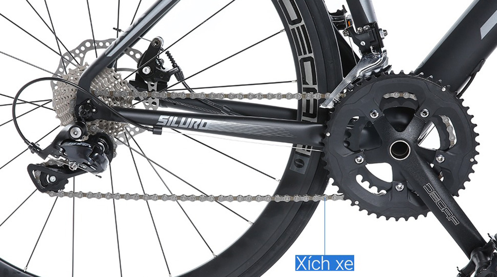 Người dùng có thể tự tin làm chủ tốc độ trên đường đua với những thao tác sang số, chuyển tốc dễ dàng nhờ mẫu xe đạp đua này được trang bị bộ truyền động với 2 đĩa trước DECAF, 9 líp SUNSHINE kết hợp với sên xe C8 và giò dĩa MPFS-424K-4A,11-28T phối hợp vận hành trơn tru, mượt mà.