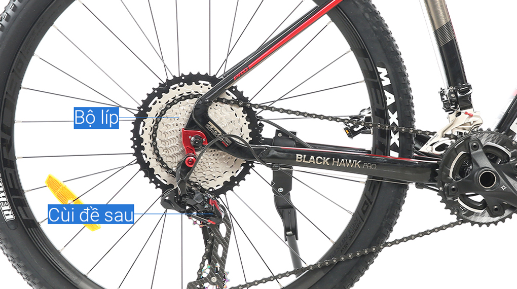 Cặp bánh xe có kích thước 27.5 inch, phù hợp với thể trạng của người có chiều cao trung bình từ 170 đến 185 cm. Bánh xe Maxxis-Pace chắc chắn nhờ vành Blackhawk Pro dày 25 mm và các gai nhỏ giúp tăng độ ma sát với mặt đường, chống trơn trượt hiệu quả.