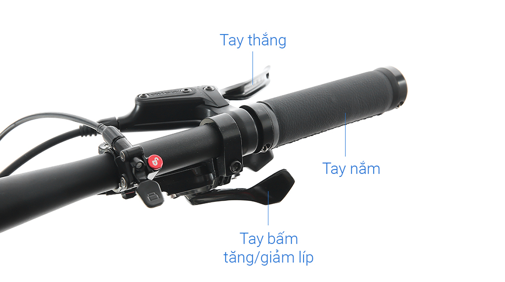 Ghi đông hợp kim nhôm không sừng, dạng thẳng cho tư thế cầm thoải mái, thẳng lưng giúp bảo vệ cột sống. Ngoài ra với thiết kế này có thể giúp xe dễ dàng vượt qua những địa hình hẹp, không gây vướng víu, dễ dàng vượt chướng ngại vật.