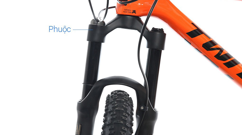 Cặp phuộc trước làm từ hợp kim nhôm có thiết kế cứng cáp với hành trình phuộc 100mm giúp xe di chuyển nhẹ nhàng trên mọi điều kiện địa hình.
