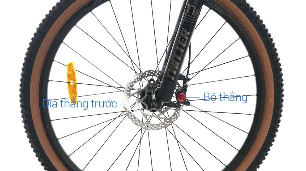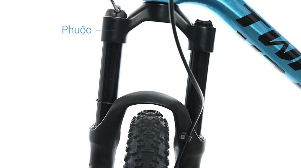 Cặp phuộc trước của xe đạp địa hình Twitter được làm bằng hợp kim nhôm cứng cáp, chịu lực tốt với hành trình dài 100 mm, vừa nâng đỡ khung xe vừa giúp người lái hạn chế cảm giác xóc nảy khó chịu khi đạp xe qua các đoạn đường gồ ghề.