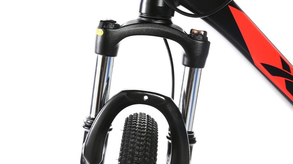 Tự tin chinh phục địa hình nhờ phuộc trước FS-008, chất liệu thép và hợp kim nhôm, hành trình dài 80 mm cho phép xe đạp có khả năng hấp thụ xung lực.