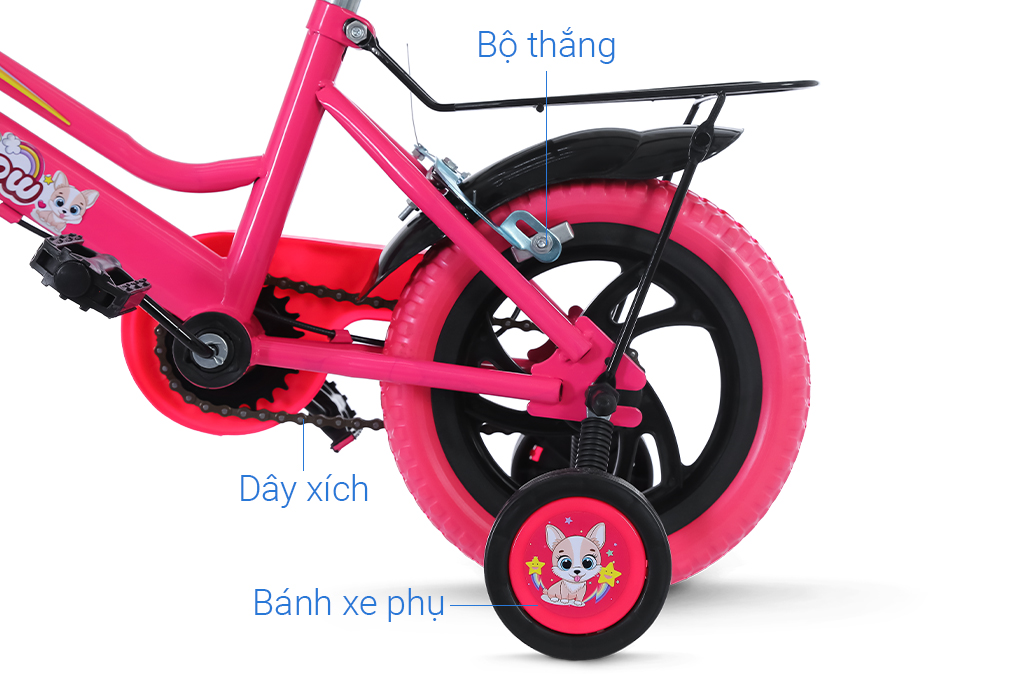 Xe đạp trẻ em được trang bị cặp bánh phụ phía sau hỗ trợ bé giữ thăng bằng trong giai đoạn đầu tập lái, có thể tháo rời khi bé đã tự tin hơn.