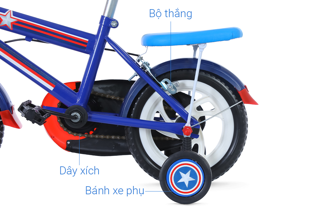 Xe đạp trẻ em Đại Phát Tài Đội Trưởng Mỹ 12 inch với kiểu dáng và màu xanh dương đẹp mắt, nổi bật, được trang trí với họa tiết hình ngôi sao đội trưởng Mỹ mang lại sự thích thú cho các bé mỗi khi sử dụng.