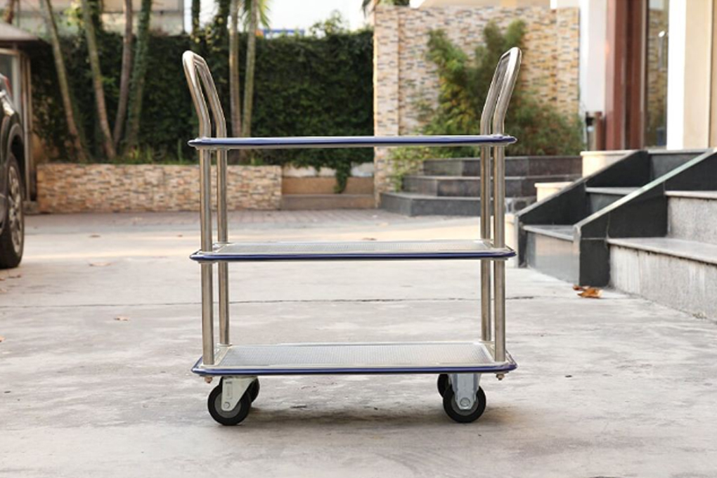 - Xe đẩy hàng 3 tầng riêng biệt, khoảng cách mỗi tầng 23.5 cm, giúp dễ phân biệt các loại hàng hóa dễ dàng tránh lộn xộn. Sản phẩm còn có 2 tay đẩy giúp thuận tiện trong việc di chuyển hàng hoá, có thể đẩy về trước hoặc kéo ra sau.