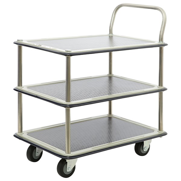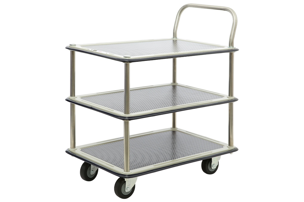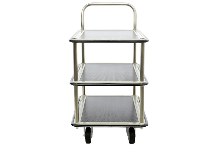 - Đảm bảo hàng hóa trên xe đẩy hàng 3 tầng được để cân đối và theo trọng tâm xe hàng nặng trước và hàng nhẹ sau.
